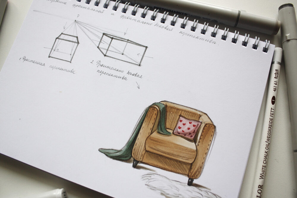 Курс построен по принципу «от простого к сложному». От правил построения основных геометрических форм перейдём к изображению реальных предметов интерьера. Каждый научится передавать объём и материальность на разных объектах, строить композиции в двух перспективах и, главное, переносить все свои самые необычные идеи на лист бумаги!
